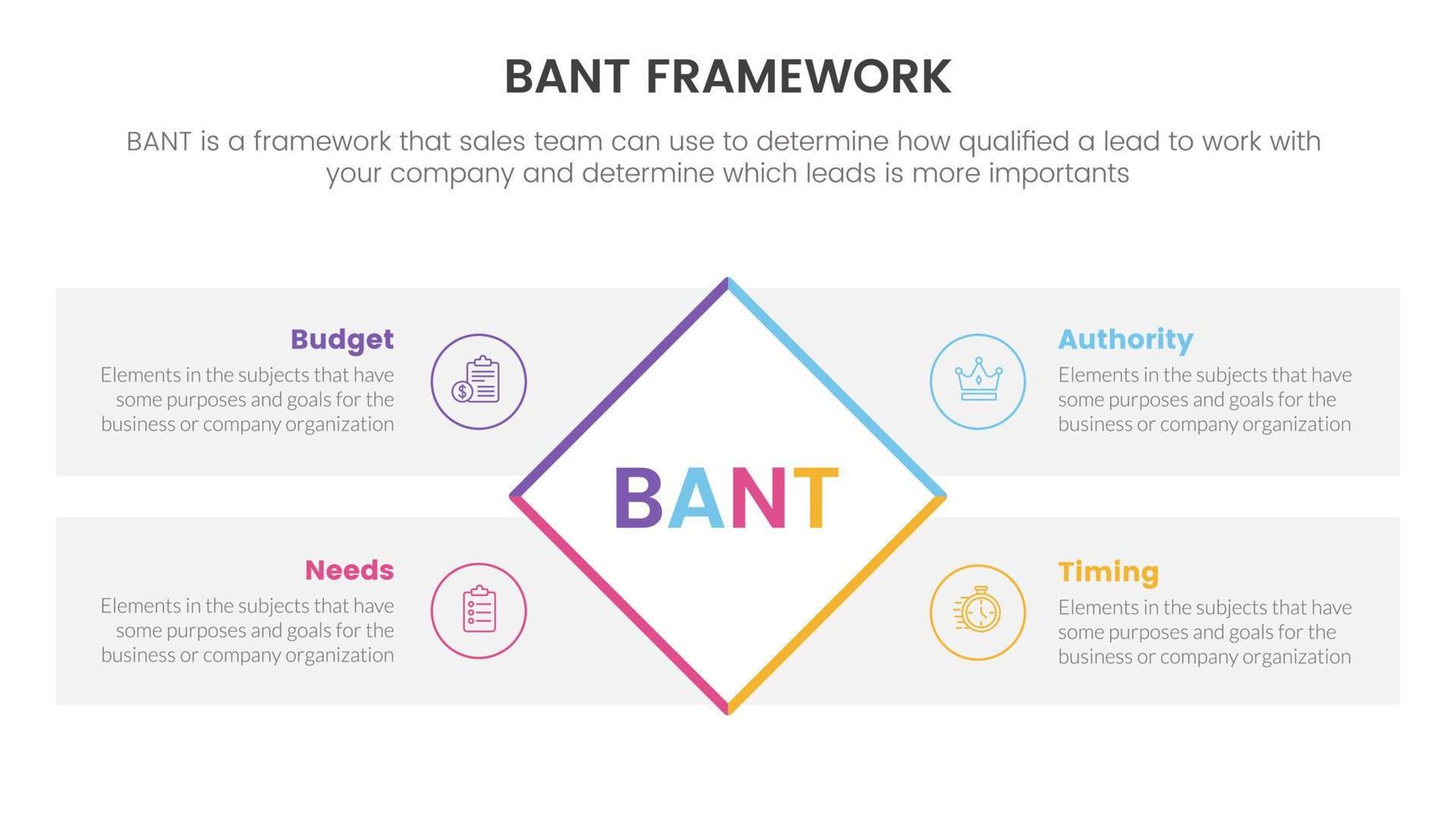 bant sales framework methodology infographic with rotated square shape center information concept for slide presentation vector