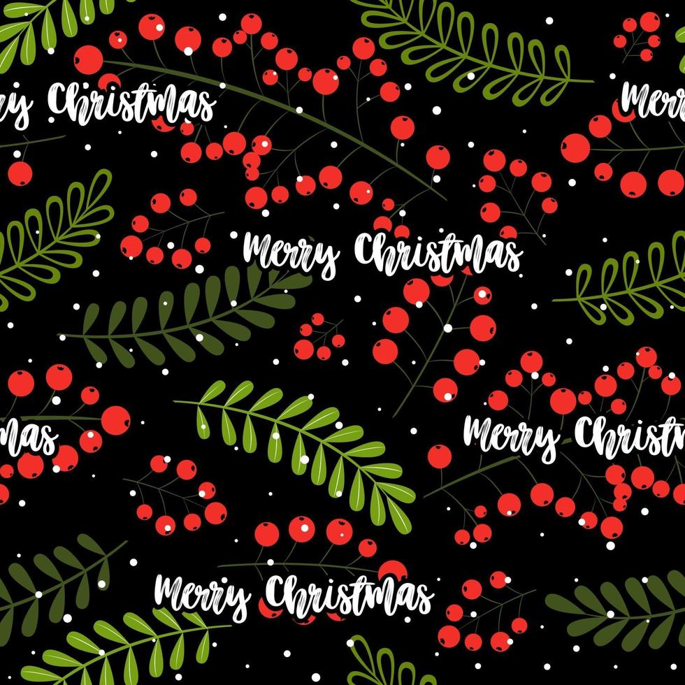 Christmas seamless pattern with rowan berry and green branches on black background. Vector background for fabric, wrapping paper and phone case. Pro Vector