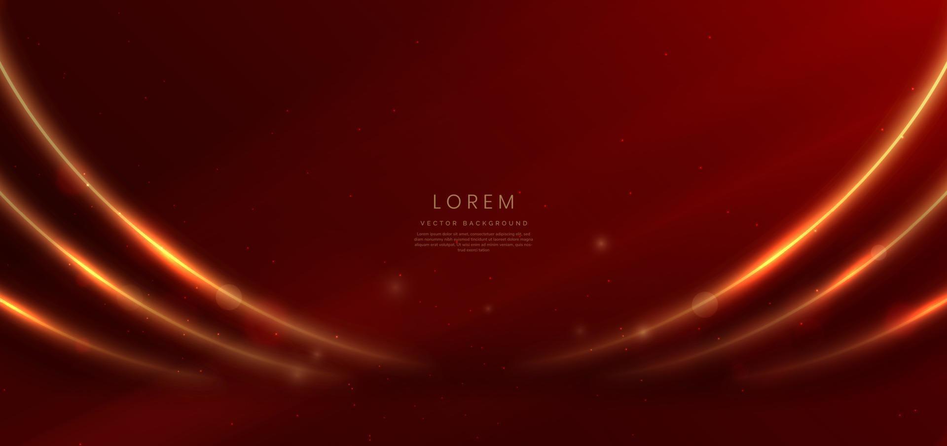 Abstract glowing gold curved lines on red background with lighting effect and sparkle with copy space for text. Luxury design style. Pro Vector