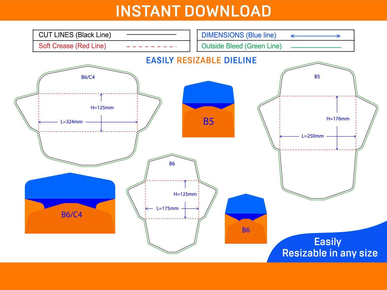 Envelope sizes dieline template and 3D envelopes Box dieline and 3D box Pro Vector