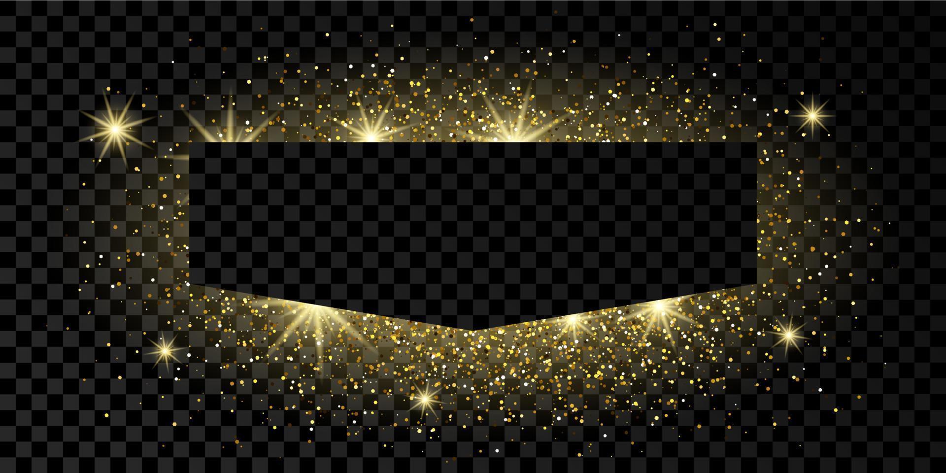 Golden frame with glitter, sparkles and flares on dark background. Empty luxury backdrop. Vector illustration. Pro Vector