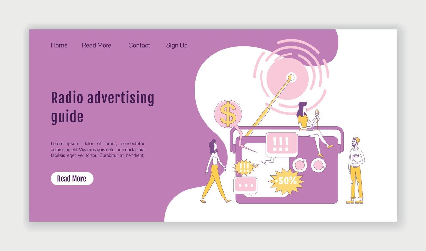 Radio advertising guide landing page flat silhouette vector template. Marketing technology homepage layout. Broadcasting one page website interface with cartoon outline character. Web banner, webpage Pro Vector