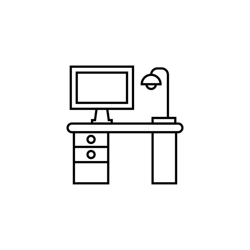 Computer and Lamp on Office Table Isolated Line Icon. It can be used for websites, stores, banners, fliers. Pro Vector