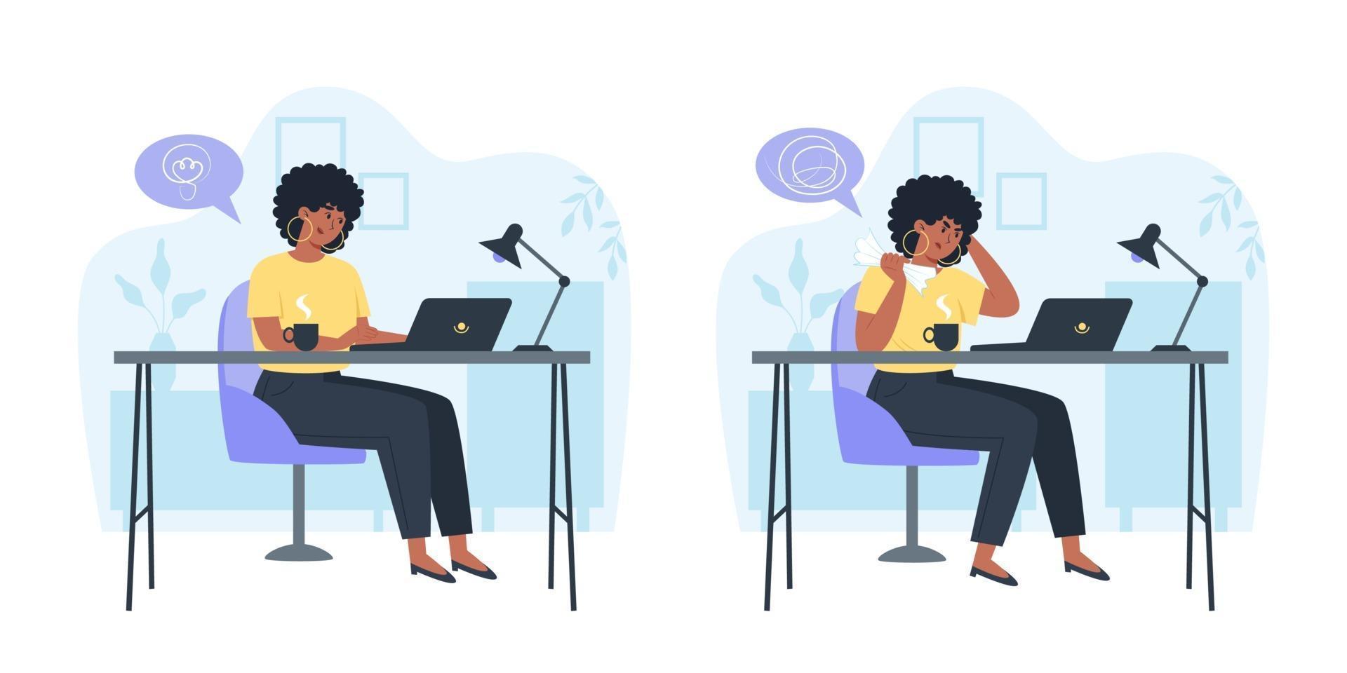 Productive employee and confused angry employee, productivity and problem solving throughout the day Pro Vector