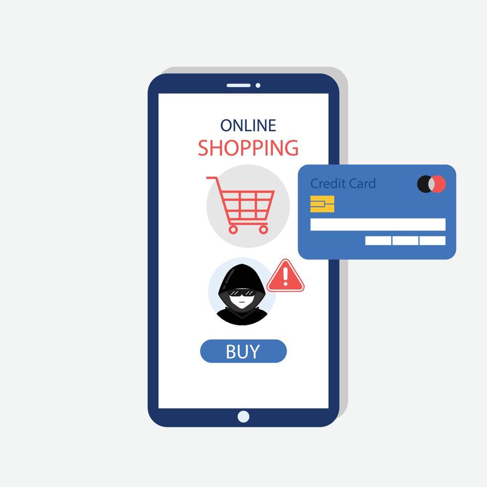 Hacker stealing credit card while hacking shopping online application on smartphone. Pro Vector