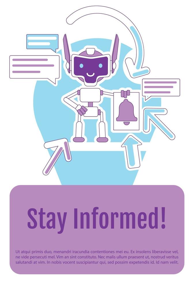 Online notification bot poster flat silhouette vector template. Stay informed brochure, booklet one page concept design with cartoon characters. Virtual assistant flyer, leaflet with text space Pro Vector