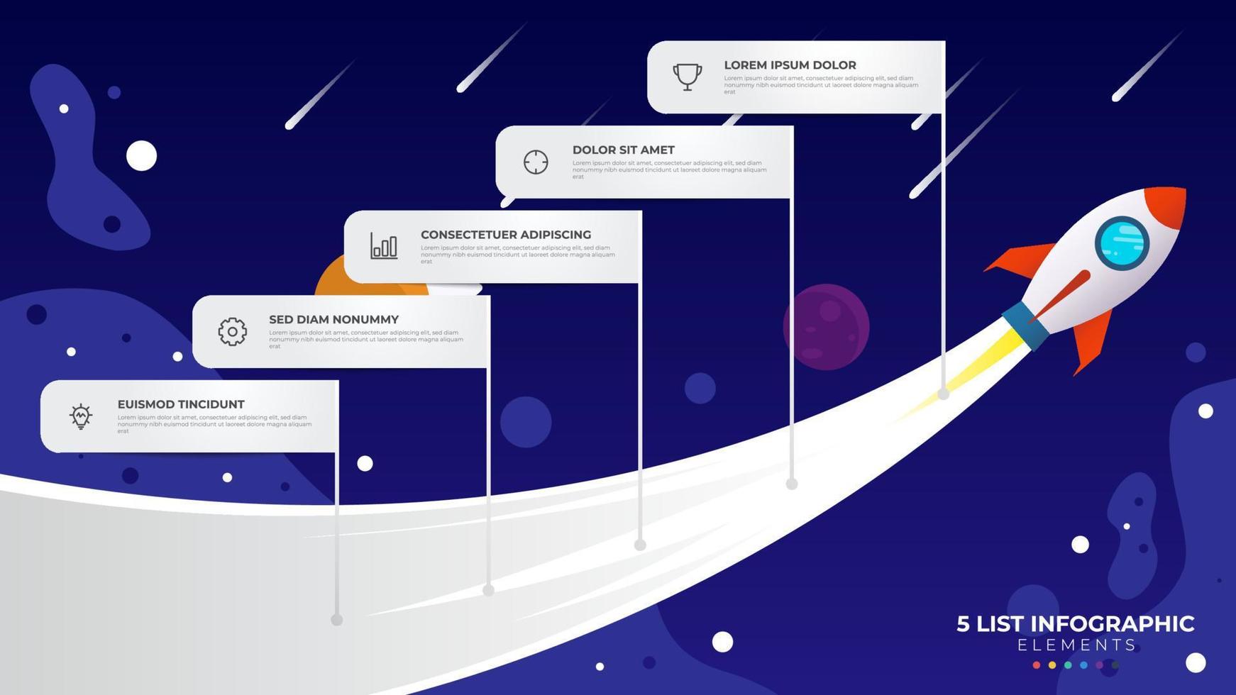 5 list of steps diagram with stair level sequence, infographic element template with rocket in the space illustration vector Pro Vector
