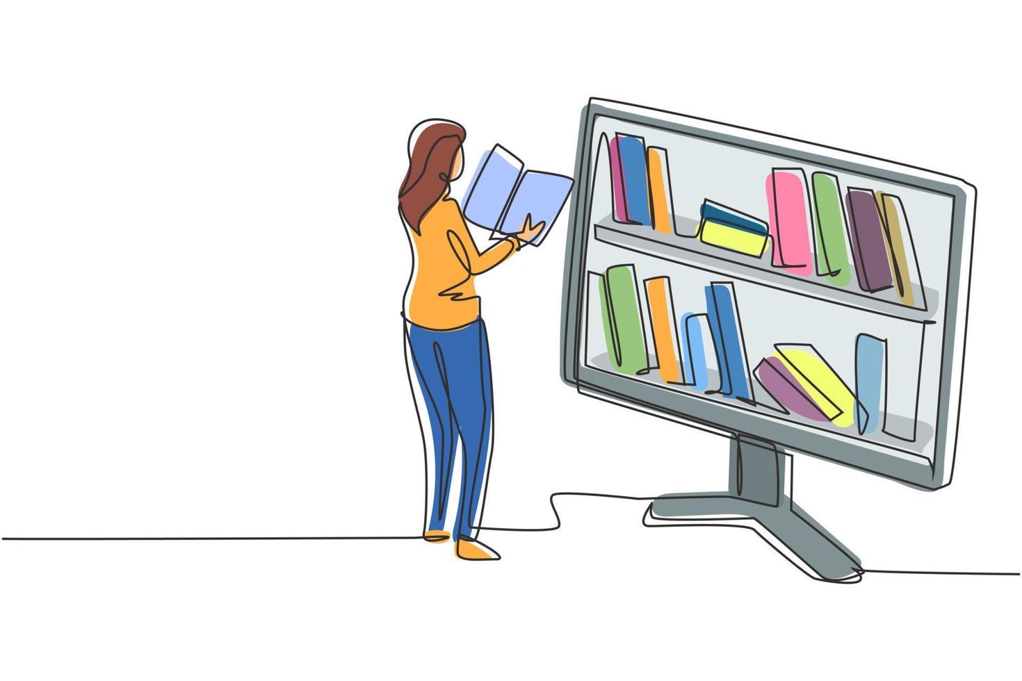 Continuous one line drawing female student reading book while standing in front of large monitor with bookshelf on screen. Mobile education concept. Single line draw design vector graphic illustration Pro Vector