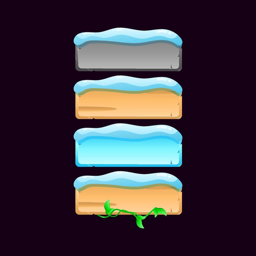 Set of winter game ui board button icon. Stone, wooden, leaf, snow texture for gui asset elements Pro Vector