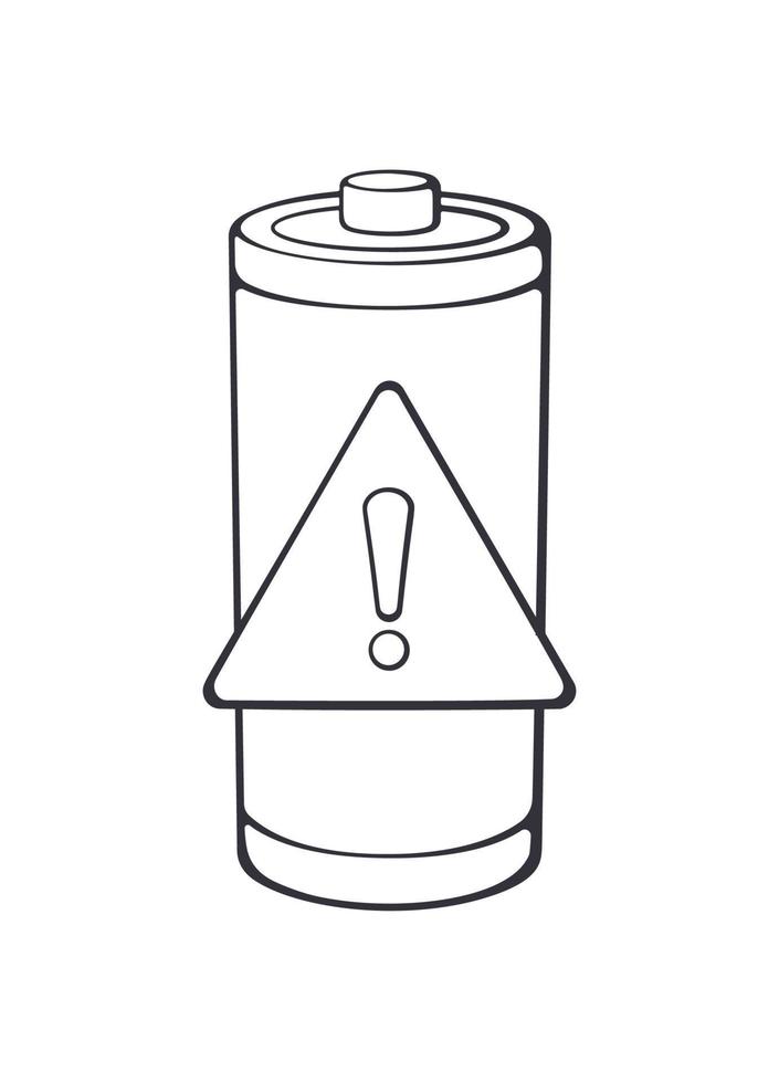 Warning status of electrical device accumulator. Outline icon. Vector illustration. Empty charge level battery indicator with warning sign. Power technology. Isolated white background Pro Vector