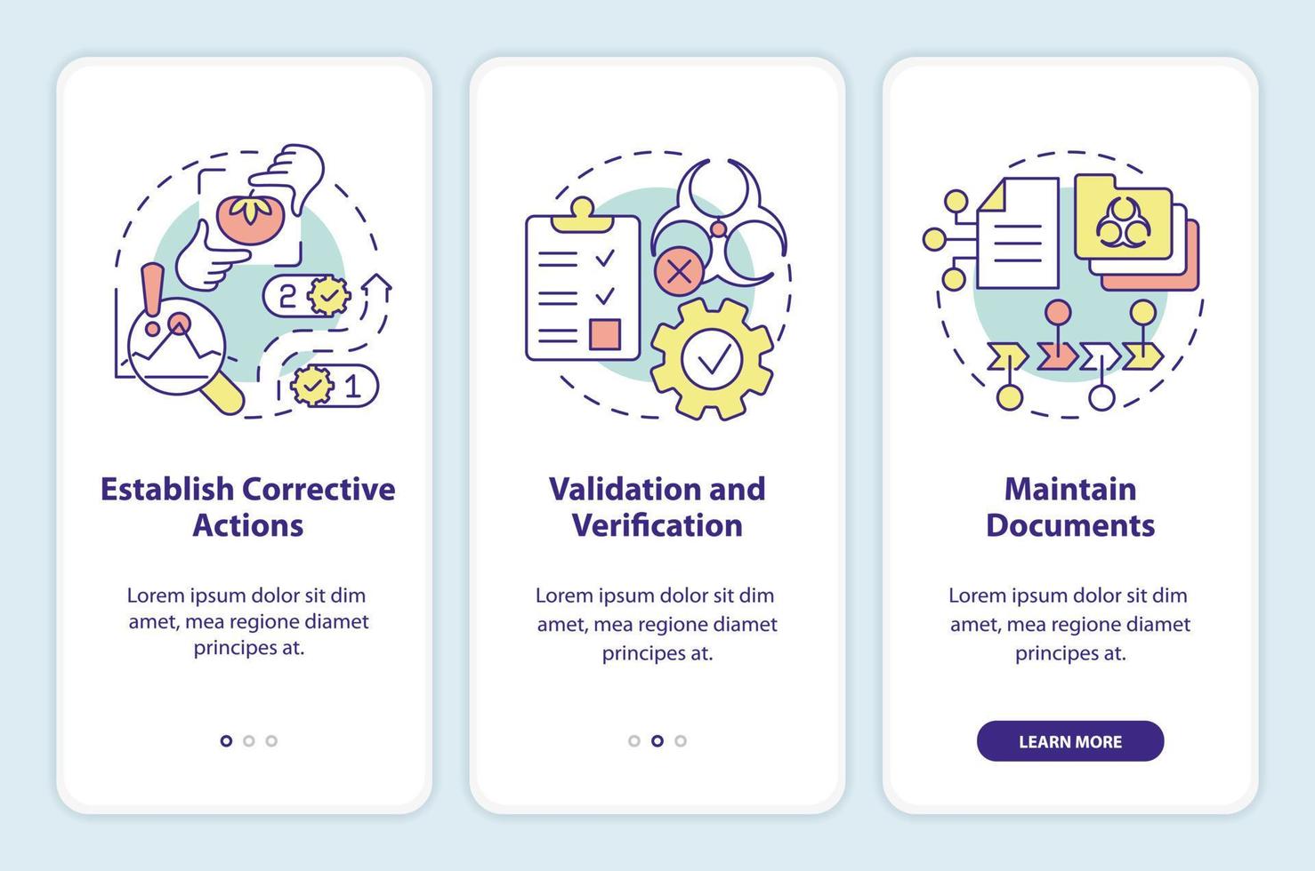 Principles of HACCP onboarding mobile app screen. Food control walkthrough 3 steps editable graphic instructions with linear concepts. UI, UX, GUI template Pro Vector