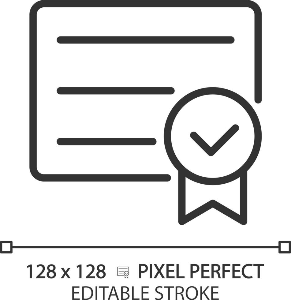 Diploma with check mark pixel perfect linear icon. College graduation document. Certificate of course completion. Thin line illustration. Contour symbol. Vector outline drawing. Editable stroke Pro Vector