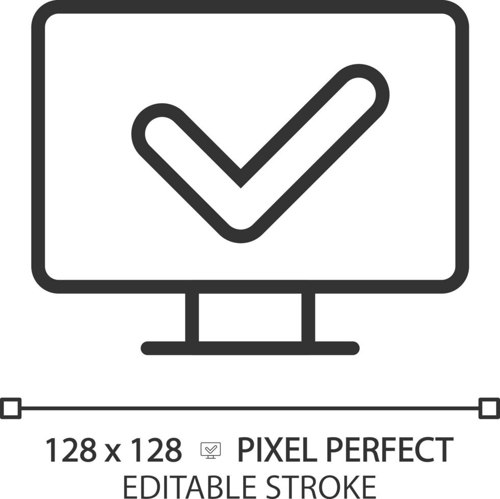 Computer with check mark pixel perfect linear icon. Correct work of PC. Install anti malware software. Thin line illustration. Contour symbol. Vector outline drawing. Editable stroke Pro Vector