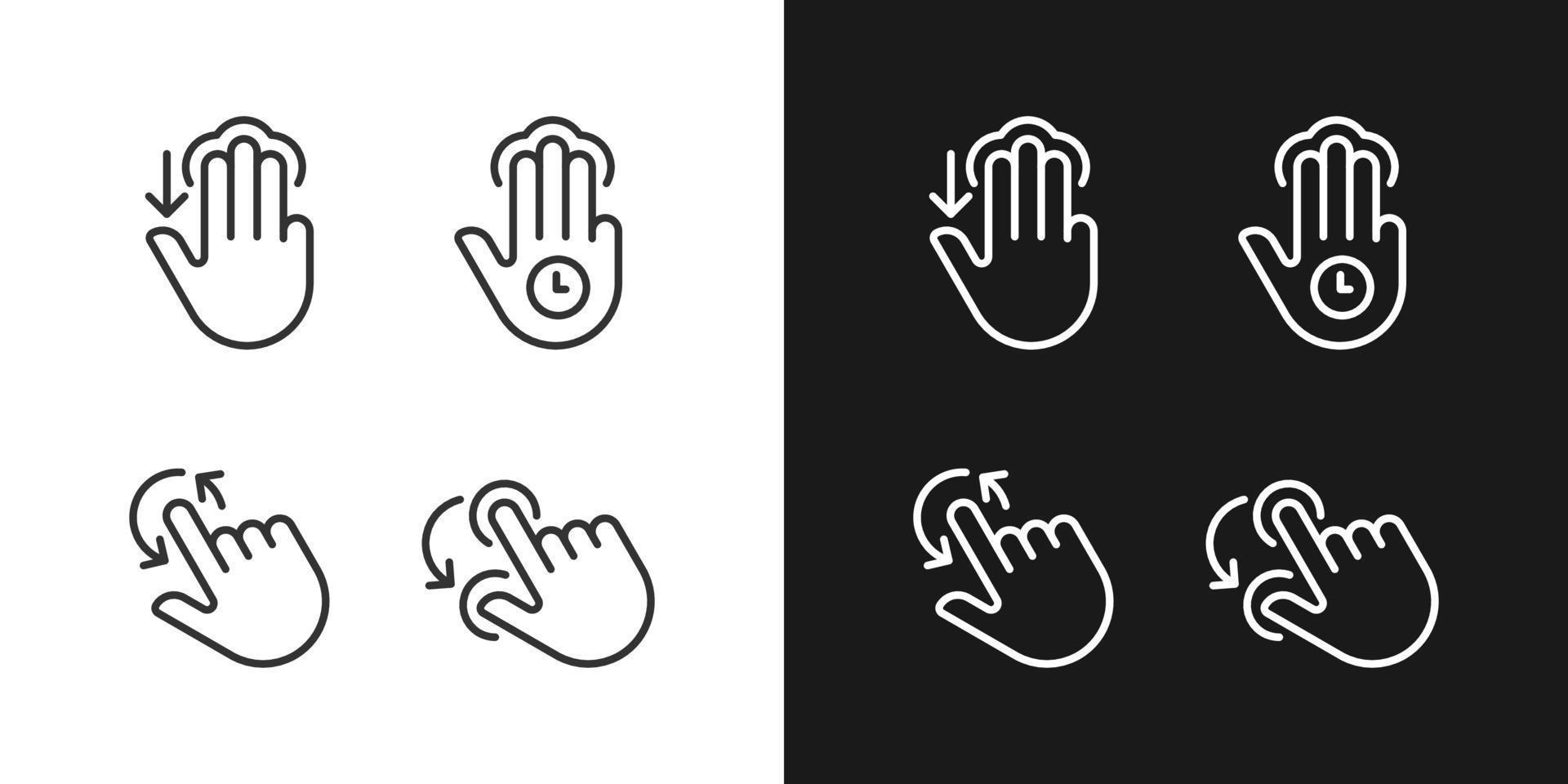 Multi touch control pixel perfect linear icons set for dark, light mode. Three finger tap and hold. Rotation function. Thin line symbols for night, day theme. Isolated illustrations. Editable stroke Pro Vector