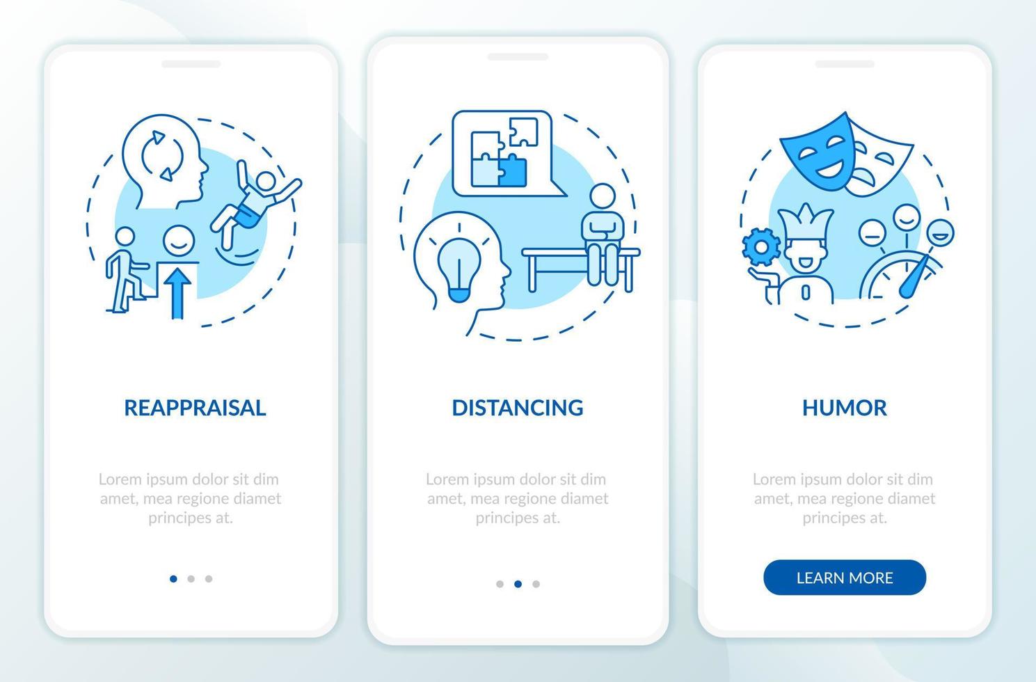 Cognitive change blue onboarding mobile app screen. Self regulation walkthrough 3 steps editable graphic instructions with linear concepts. UI, UX, GUI template Pro Vector and Pro SVG