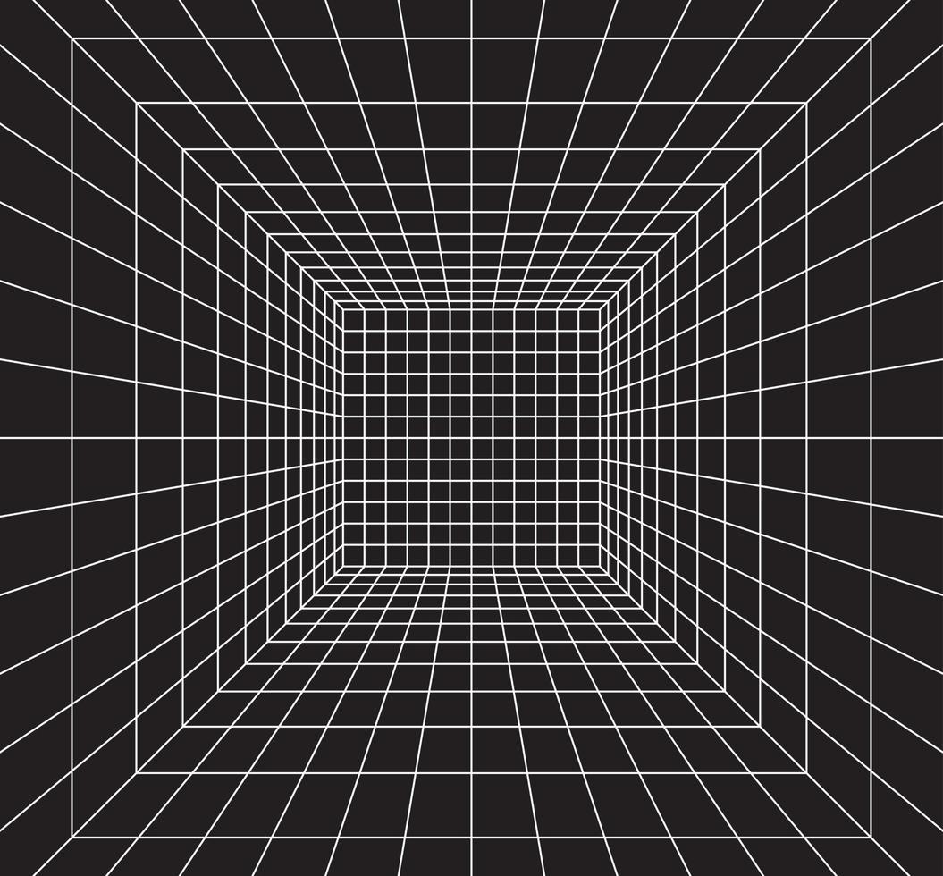 Grid room in perspective in 3d style. Indoor wireframe from white laser beam, digital empty box. Abstract geometric design Pro Vector