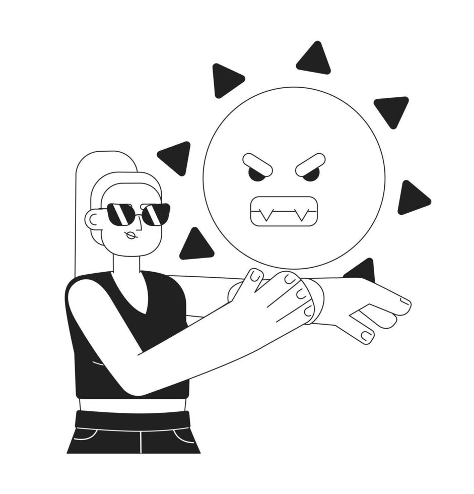 Protect from sun UV rays monochrome concept vector spot illustration. Editable 2D flat bw cartoon character for web UI design. Apply sunscreen creative linear hero image for landings, mobile headers Pro Vector