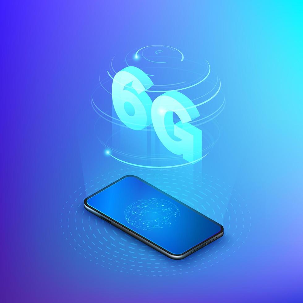 6g fast mobile networks. Mobile phone with global network on screen and hologram of wireless networks with isometric text 6G inside. Technology background. Vector illustration Pro Vector