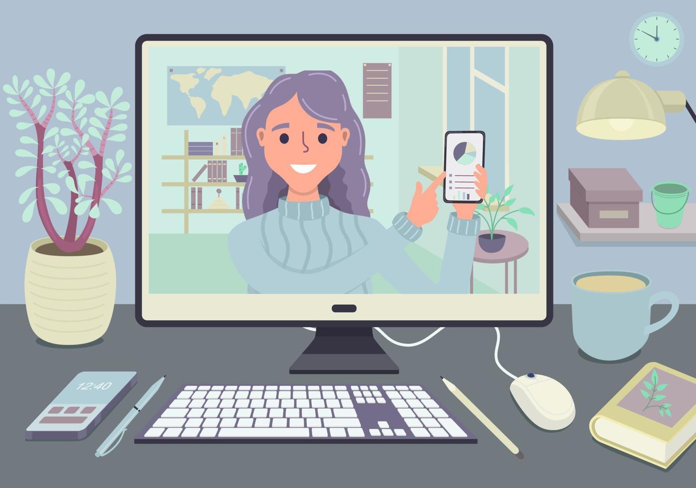 Stay and work from home video conference meeting concept. Workplace with computer screen group of people talking by internet. Web communication. Stream and webinar. Pro Vector