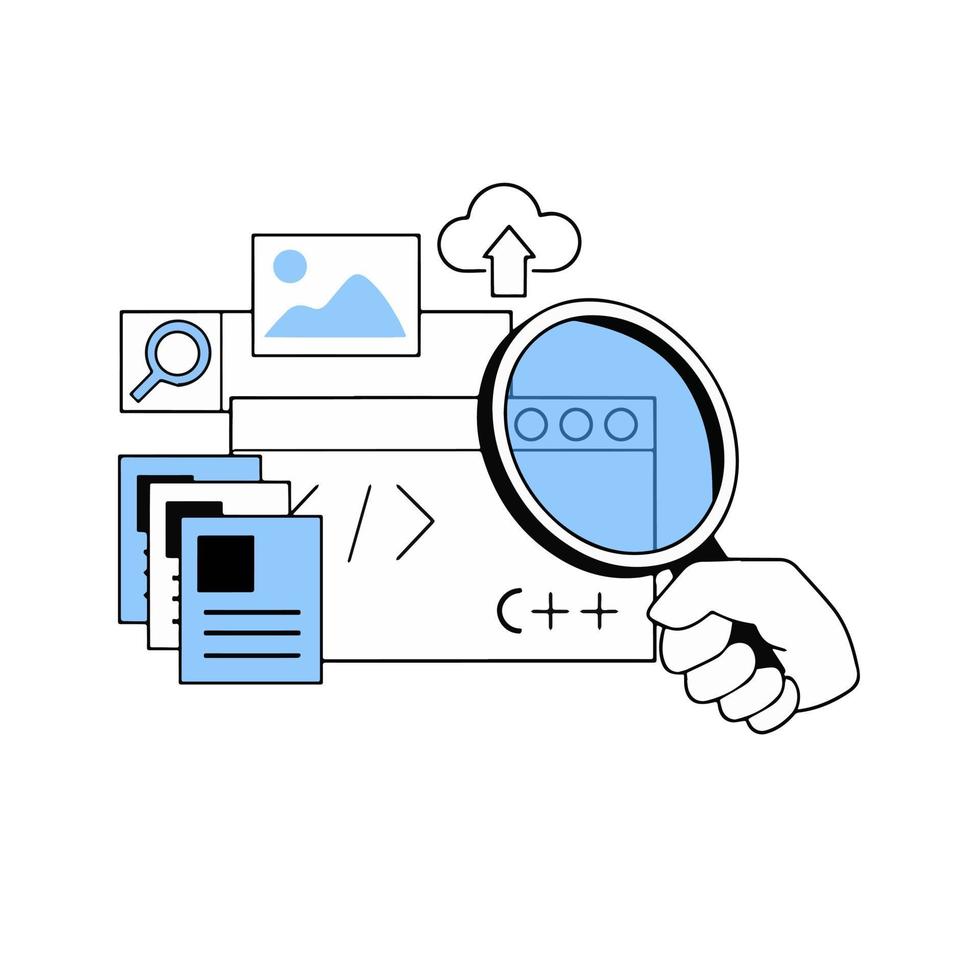 Development of the website and application web design. Outline hand holds a magnifying glass on the icons and signs. Digital profession. Search Programming, Coding Pro Vector