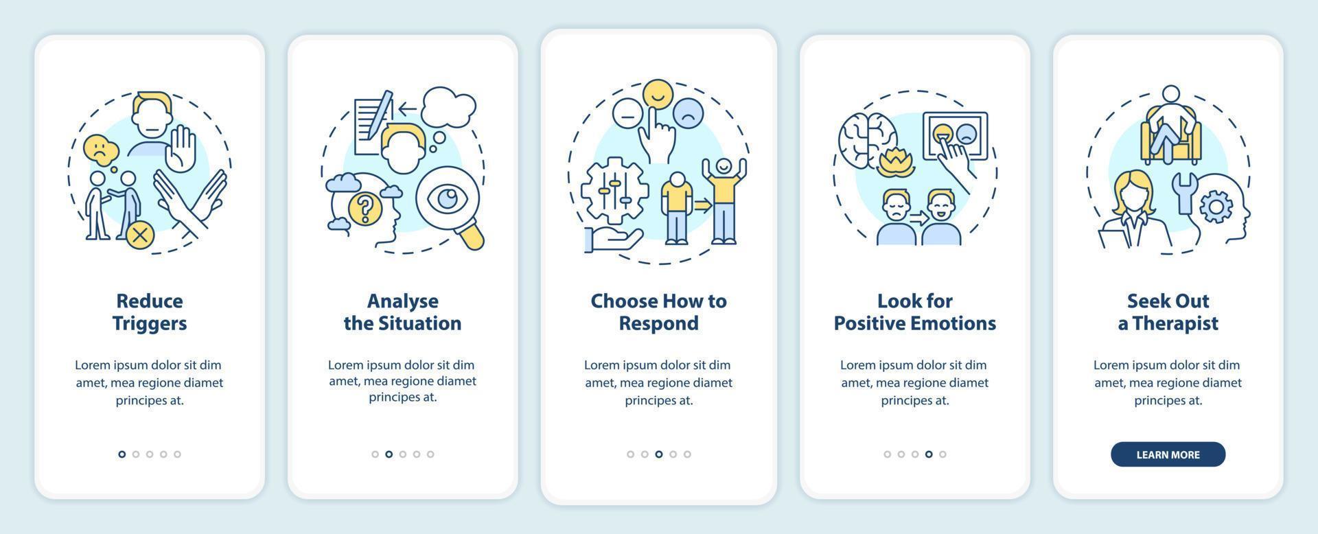 Strategies for emotional regulation onboarding mobile app screen. Walkthrough 5 steps editable graphic instructions with linear concepts. UI, UX, GUI template Pro Vector