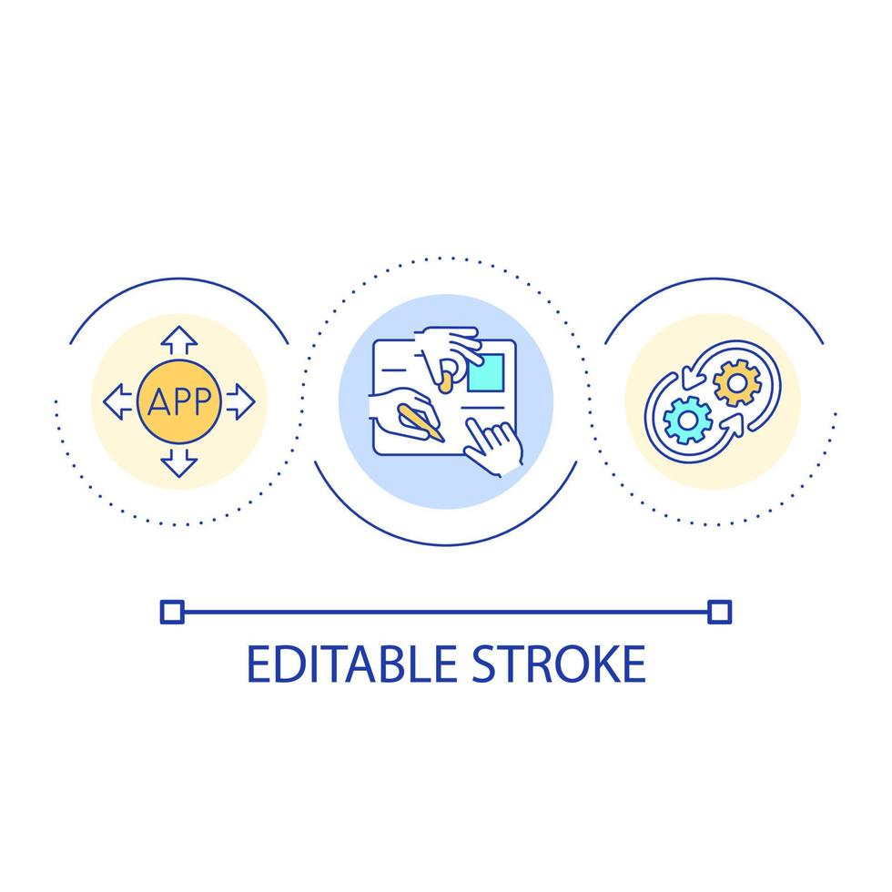 Team work upon app development loop concept icon. Brainstorming in IT company. Researching product abstract idea thin line illustration. Isolated outline drawing. Editable stroke Pro Vector