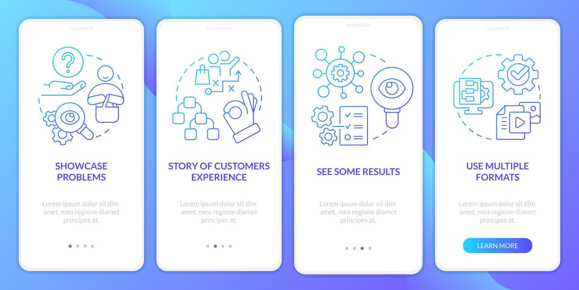 Elements of case study blue gradient onboarding mobile app screen. Structure walkthrough 4 steps graphic instructions with linear concepts. UI, UX, GUI template Pro Vector