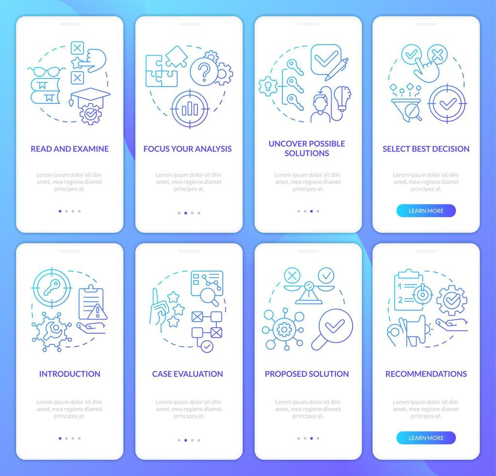 Case study structure and draft blue gradient onboarding mobile app screen set. Walkthrough 4 steps graphic instructions with linear concepts. UI, UX, GUI template Pro Vector