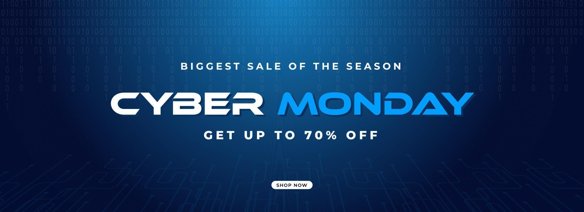 Biggest Sale Of The Season Cyber Monday Header or Banner Design with Discount Offer on Blue Binary Code and Circuit Board Background. Pro Vector
