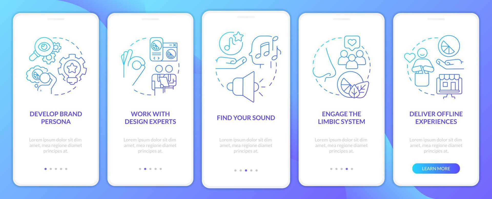 Sensory advertising strategies blue gradient onboarding mobile app screen. Walkthrough 5 steps graphic instructions with linear concepts. UI, UX, GUI template Pro Vector