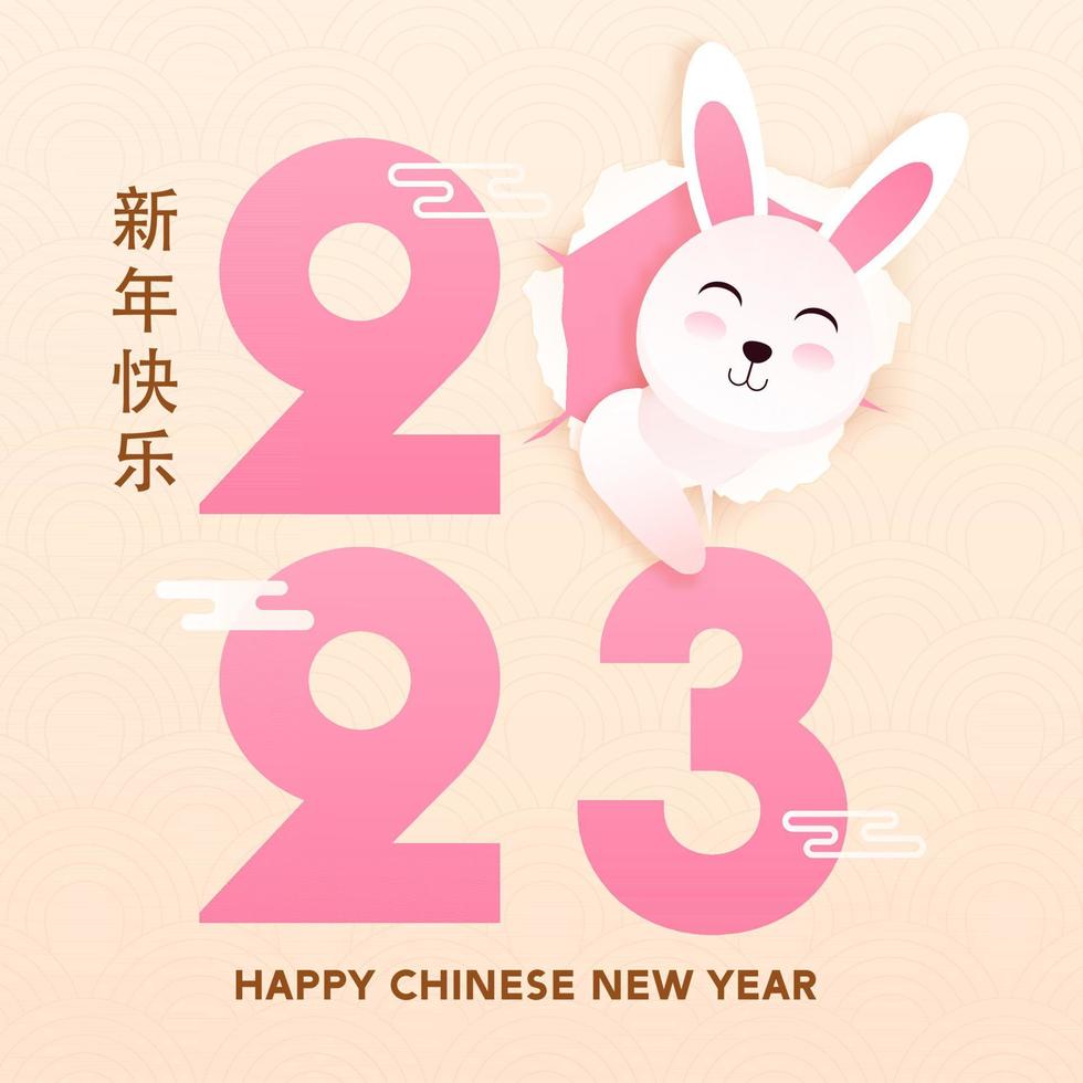 Pink 2023 Number With Cute Rabbit Popping Out Of Torn Paper On Pastel Peach Semi Circle Pattern Background For Happy Chinese New Year Concept. Pro Vector