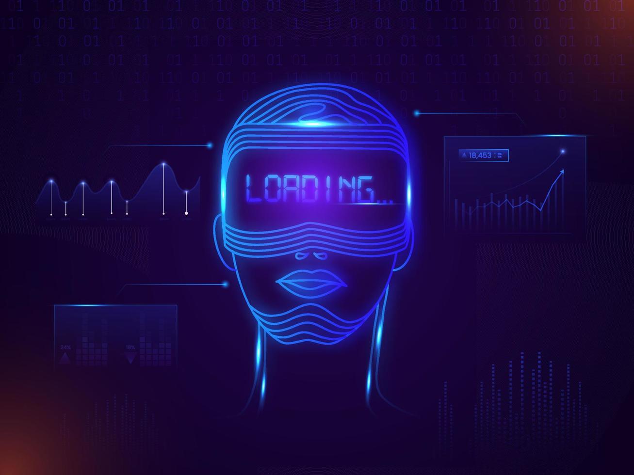 Holographic Screen Technology Background With Man Wearing VR Goggles Showing Status of Loading System. Pro Vector