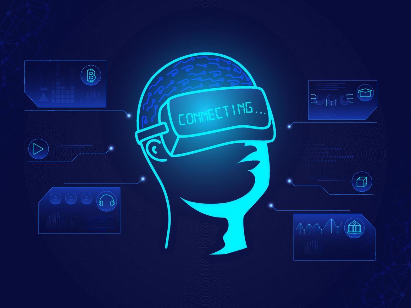 Holographic Screen Technology Background With Man Wearing VR Goggles Showing Status of Connecting. Pro Vector