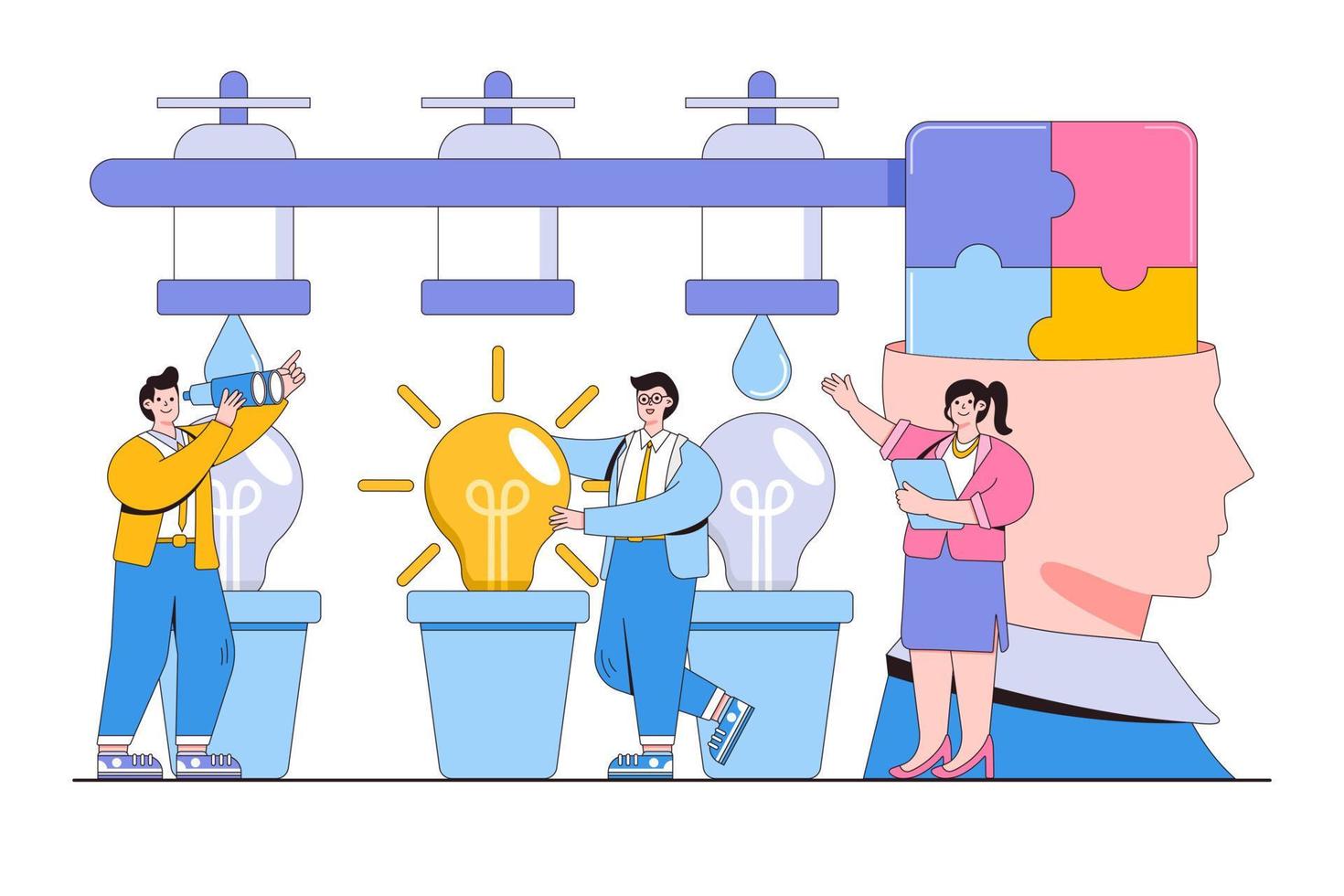 Brainstorming, finding and generating new solutions concept. Business people characters maturing ideas form of light bulb. Outline design style minimal vector illustration for landing page Pro Vector