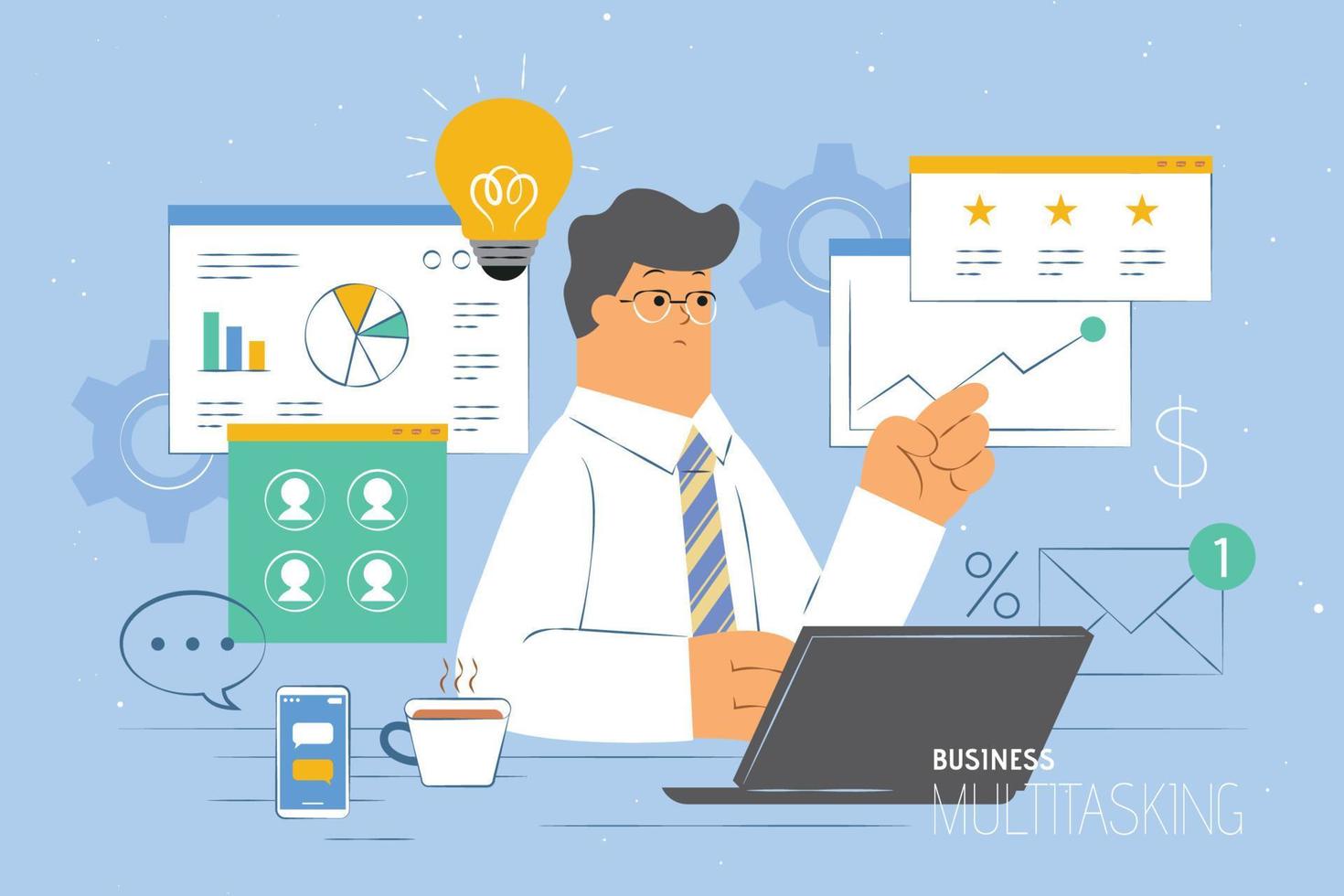 Busy multitasking businessman working with web browsers floating in the air, flat design concept Pro Vector