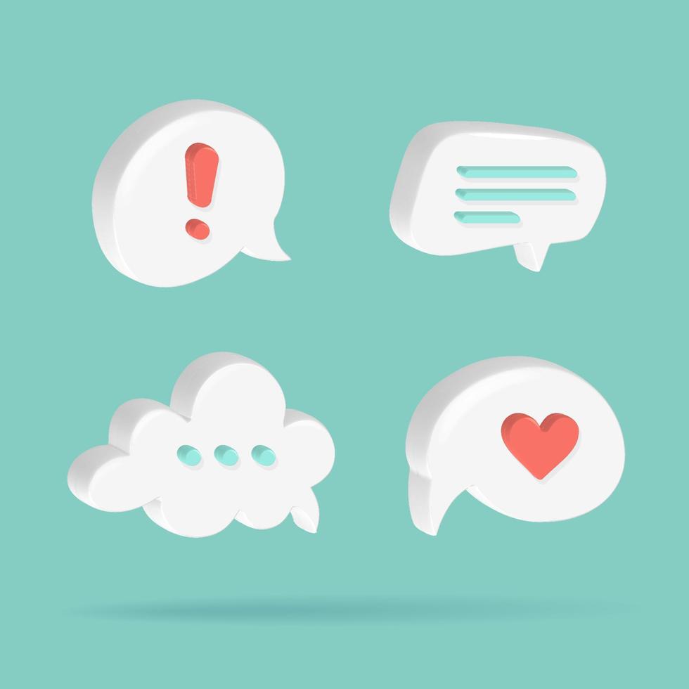 Speech, communication, dialogue, like, protest, notification, various shapes bubbles - realistic icon set. 3d render vector illustration. Pro Vector