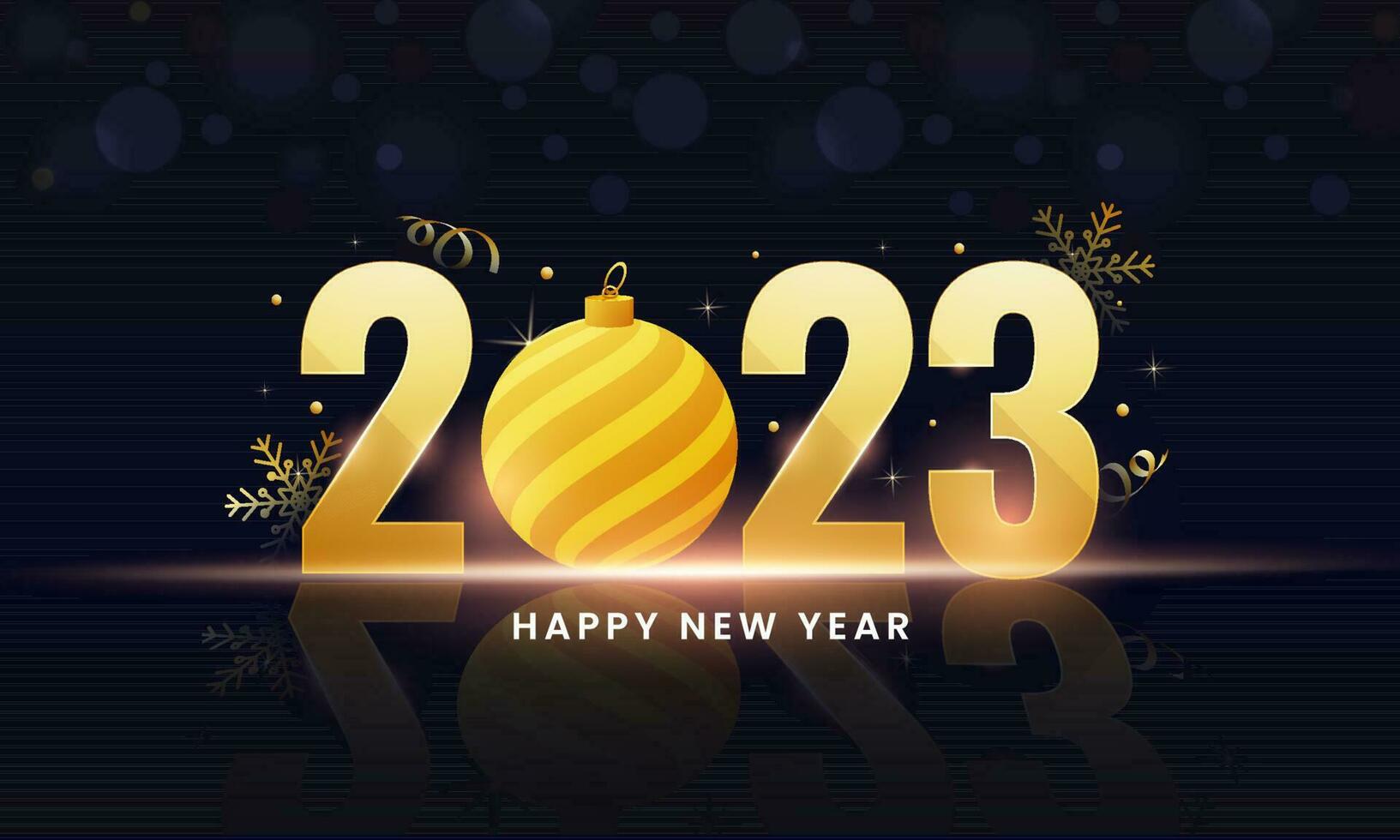 Golden 2023 Number With Bauble, Snowflakes, Curl Ribbon On Dark Blue And Black Shiny Bokeh Blur Background For Happy New Year Concept. Pro Vector