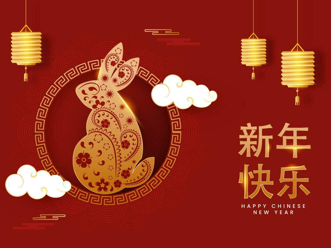 Mandarin Text Of Golden Happy Chinese New Year With Zodiac Rabbit Symbol, Clouds And Shiny Lanterns Hang On Red Background. Pro Vector
