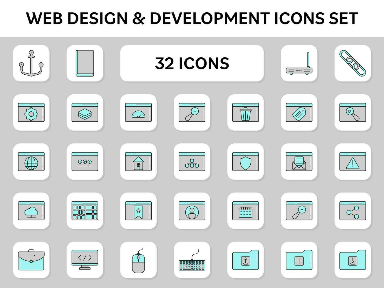 Grey And Turquoise Web Development Icon Set On White Square Background. Pro Vector