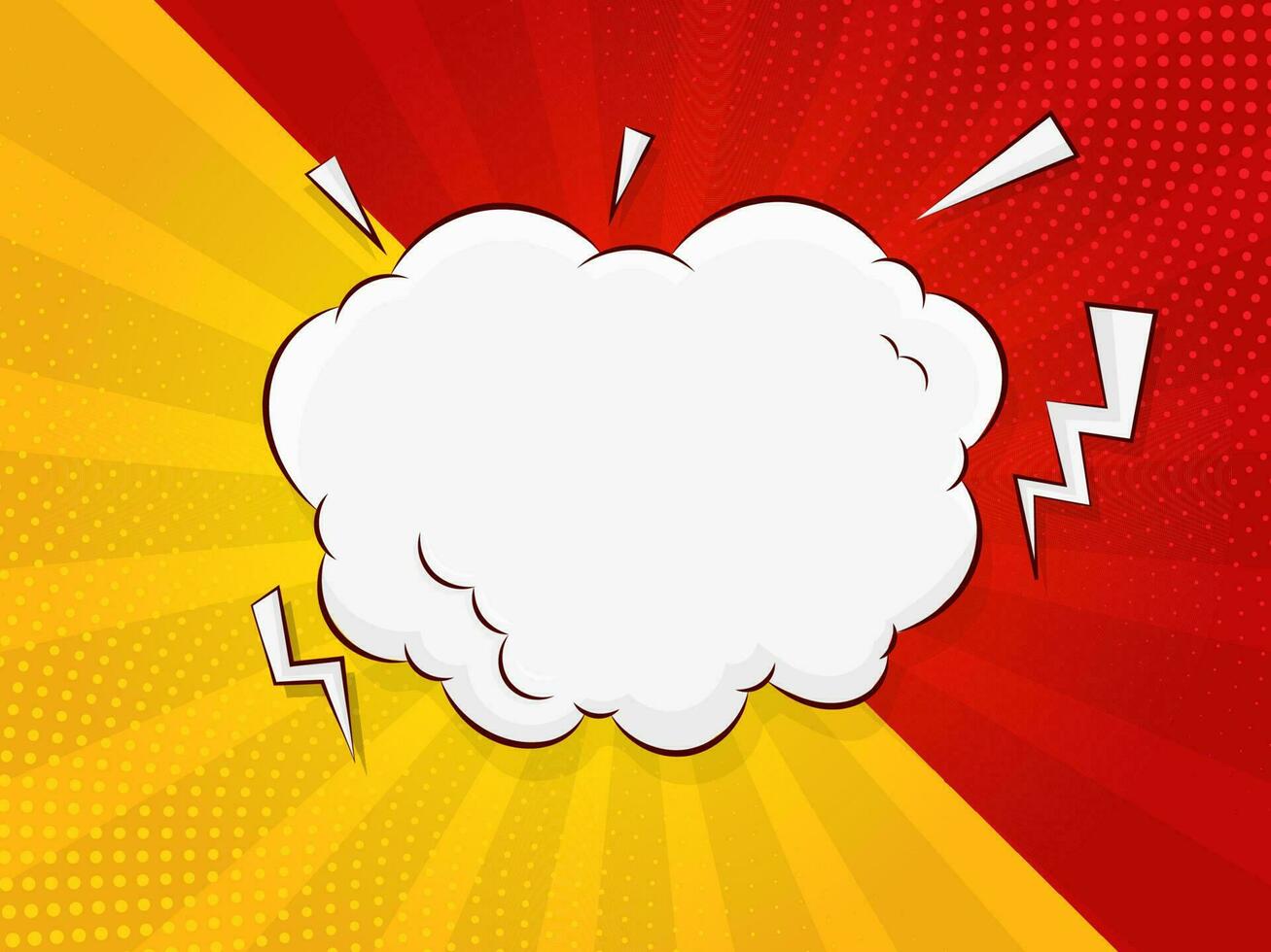 Empty Comic Cloud Frame With Lightning Bolts On Red And Yellow Rays Dotted Background. Pro Vector
