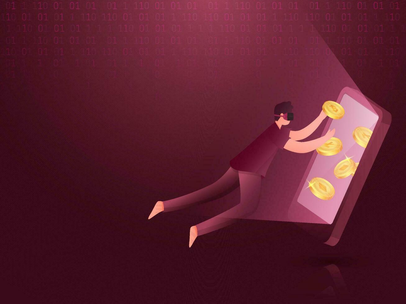 Young Man Wearing Virtual Reality Headset And 3D Golden Cryptocurrency Inside Smartphone Against Red Binary Code Background. Pro Vector