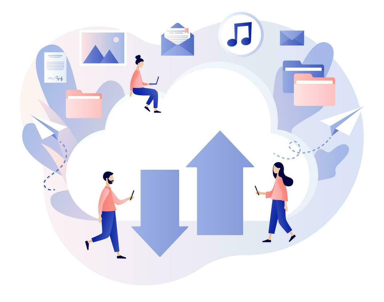 Cloud storage. Cloud computing services. Tiny people place data, music, photo, video in big cloud server. Data processing. Modern flat cartoon style. Vector illustration on white background Pro Vector