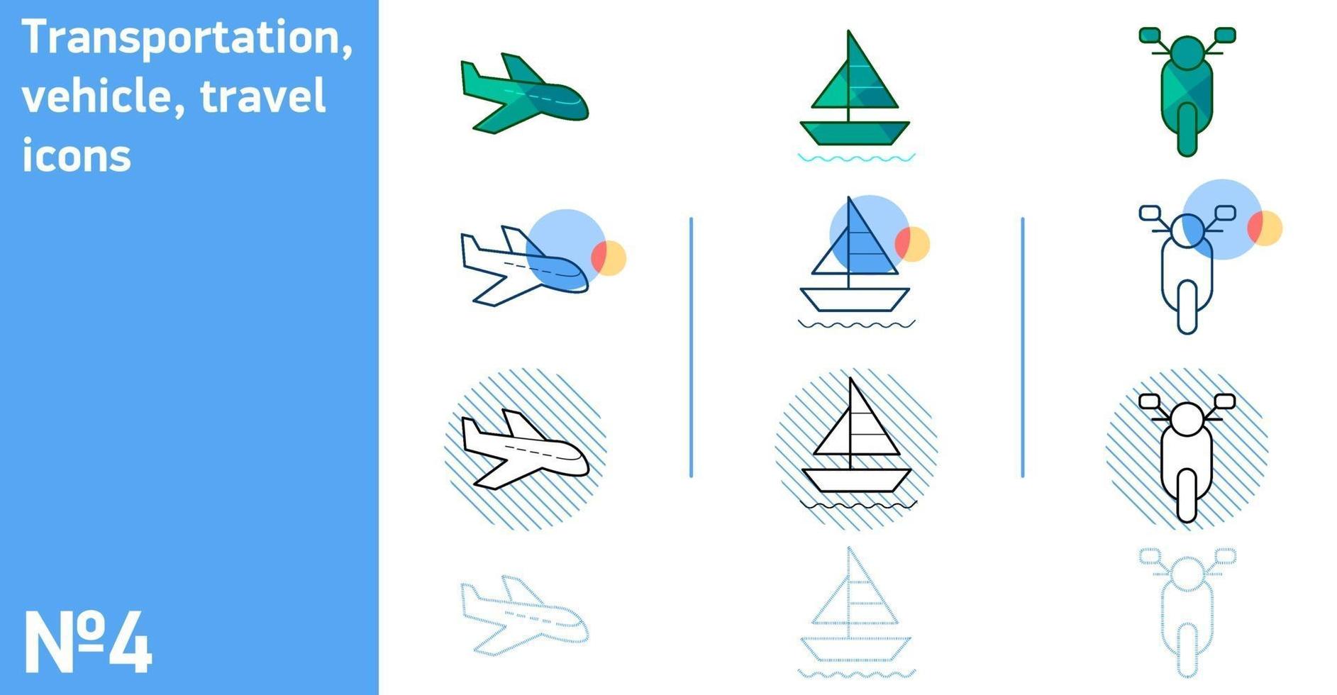 This is a set of icons of an airplane and a ship and a motorcycle in a different style Free Vector
