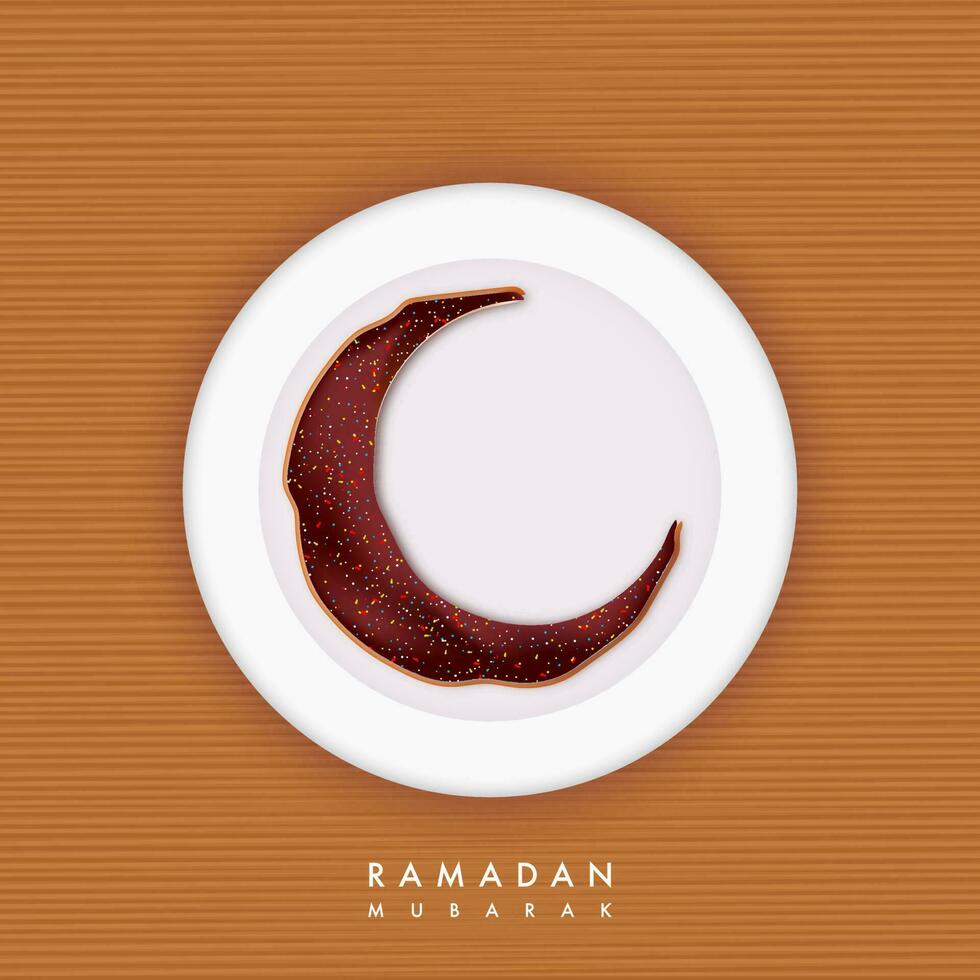 Top View Of Crescent Moon Shape Donut Over Plate On Brown Stripe Pattern Background. Pro Vector