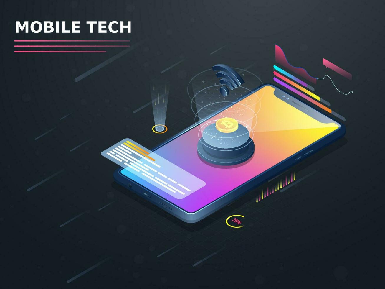 3D Smartphone with Bitcoin Server and Infographic Multiple Screen for Mobile Technology Concept. Pro Vector