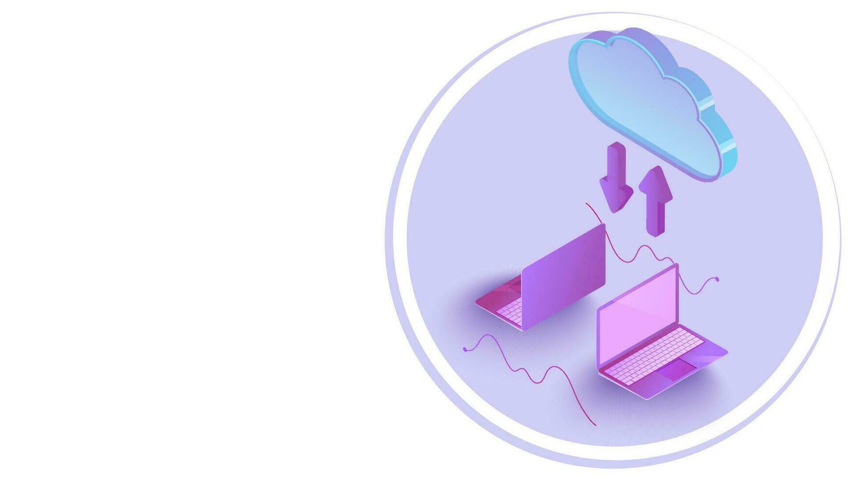 3D isometric illustration of laptop connected with cloud data server downloading and uploading for Data Management or Cloud Storage concept. Pro Vector
