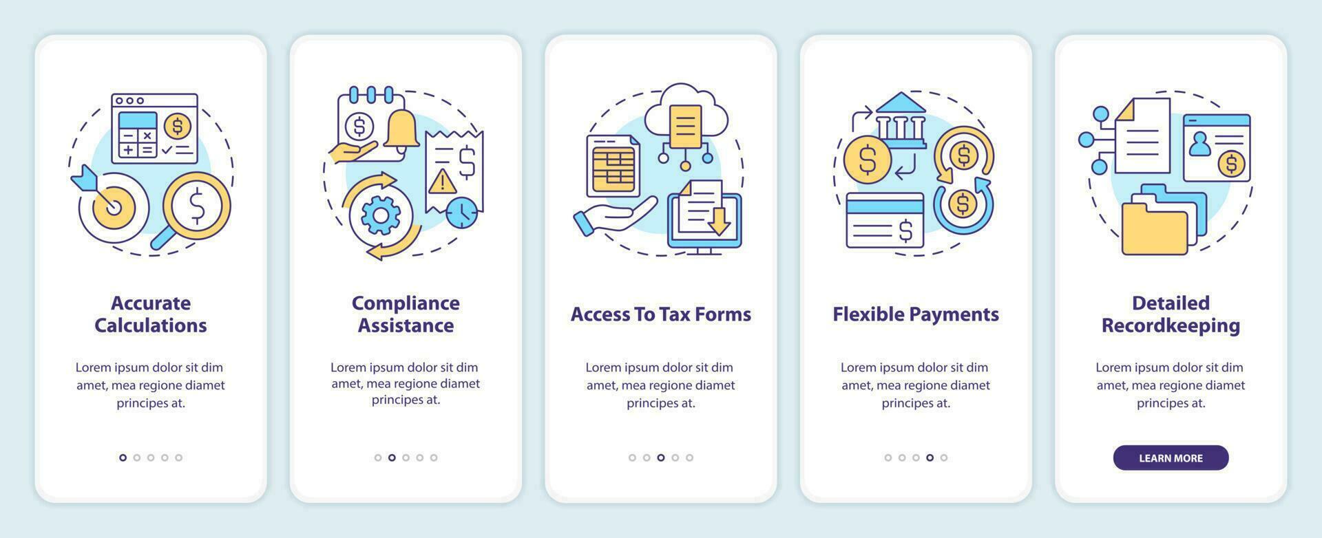 Payroll management software benefits onboarding mobile app screen. Walkthrough 5 steps editable graphic instructions with linear concepts. UI, UX, GUI template Pro Vector
