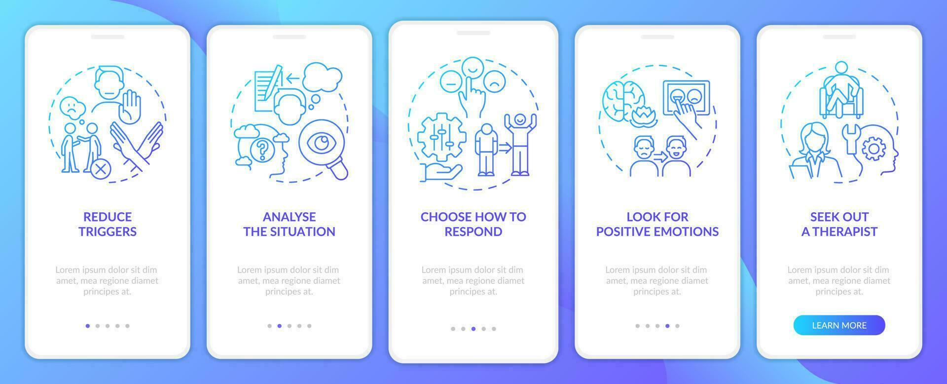 Strategies for emotional regulation blue gradient onboarding mobile app screen. Walkthrough 5 steps graphic instructions with linear concepts. UI, UX, GUI template Pro Vector and Pro SVG