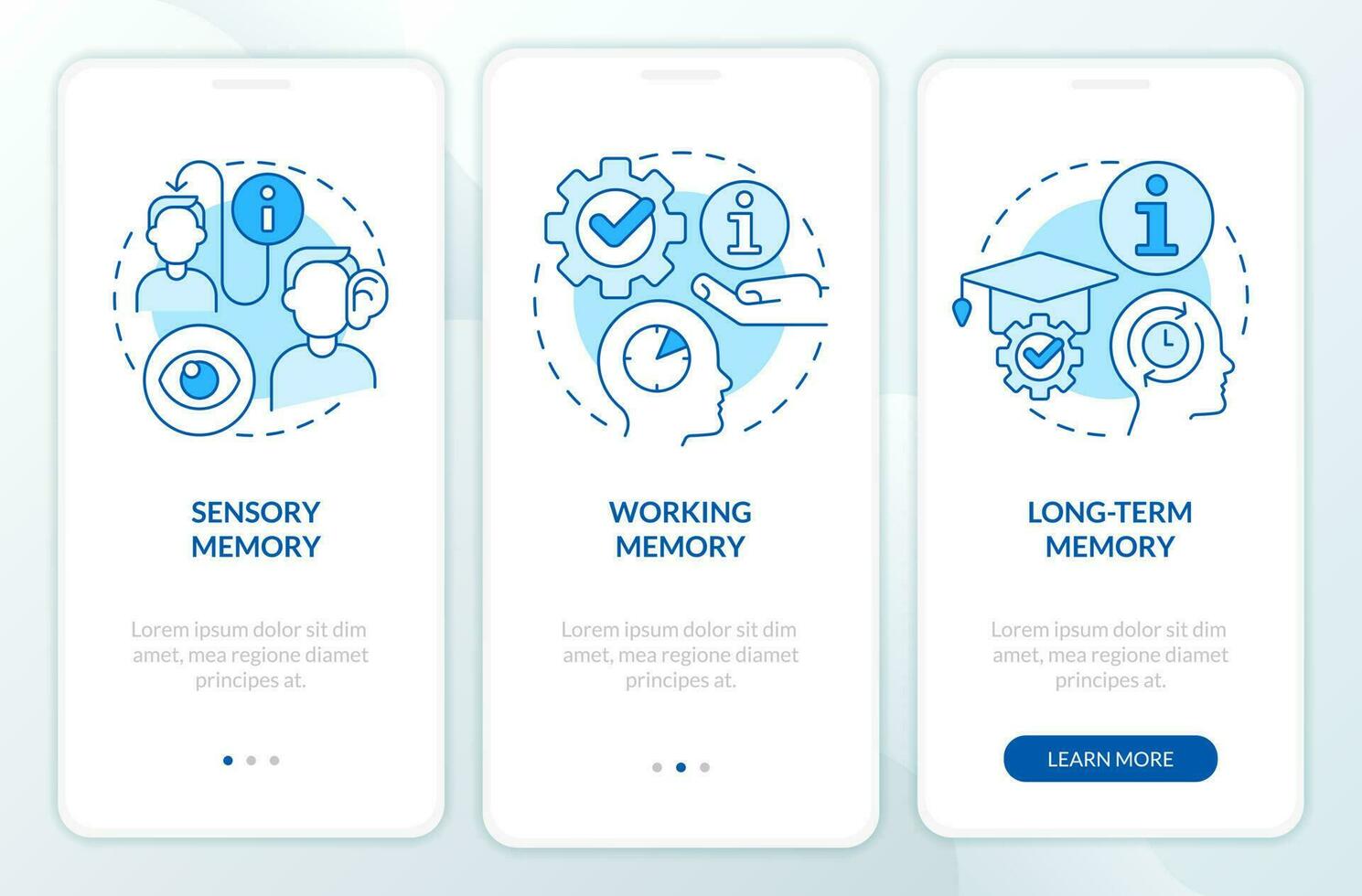 Memory and microlearning blue onboarding mobile app screen. Walkthrough 3 steps editable graphic instructions with linear concepts. UI, UX, GUI template Pro Vector and Pro SVG
