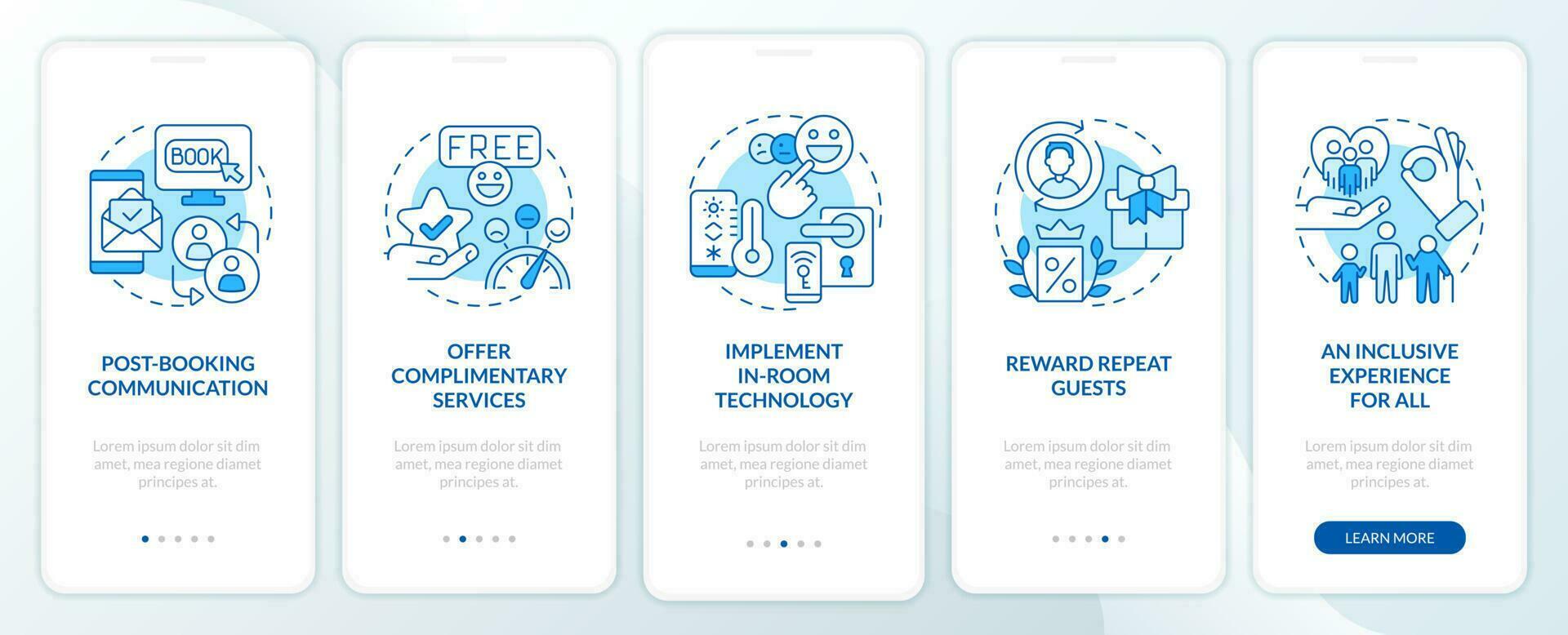 Increase guest satisfaction in hotels blue onboarding mobile app screen. Walkthrough 5 steps editable graphic instructions with linear concepts. UI, UX template Pro Vector